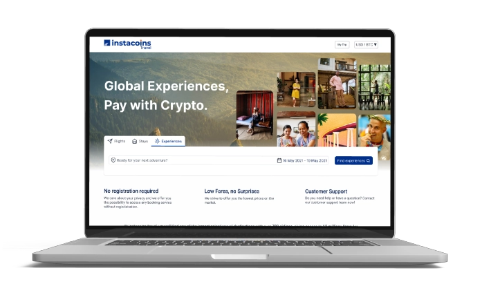 Browse flights, stays or experiences through the Instacoins travel platform.